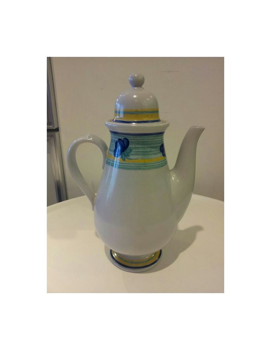 La caffettiera con decoro Torquoise di Mancioli è in porcellana da fuoco.